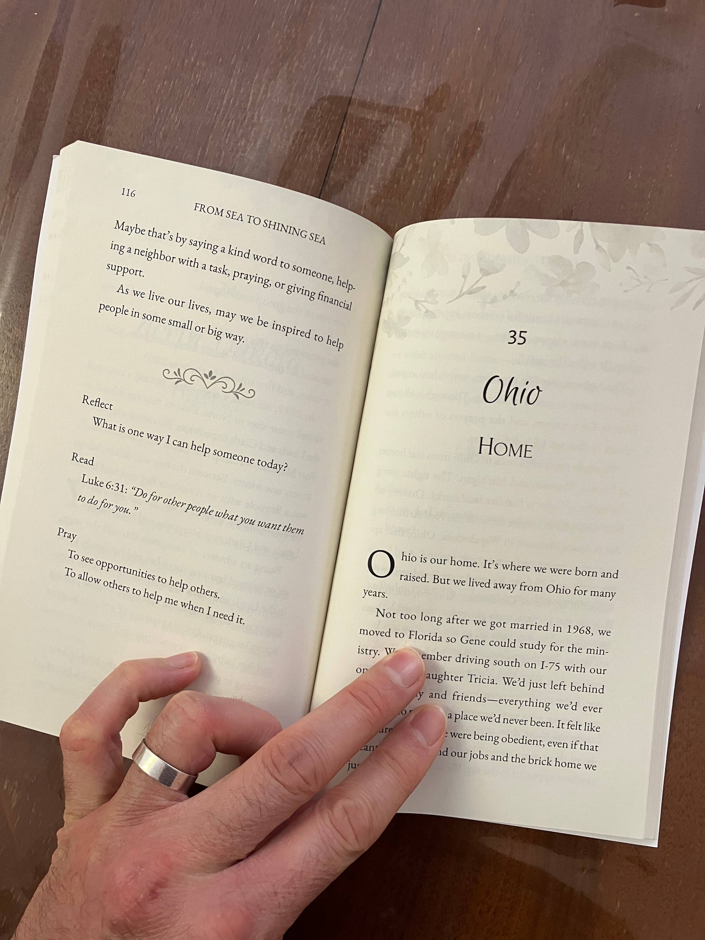 Hi Reader, Last Sunday, we received a package with proof copies of From Sea to Shining Sea--the new 50-day devotional book I wrote with my parents, highlighting their travels to all 50 states. My dad proofread the paperback to check for any formatting or other minor issues that may have slipped through. And he did find some things that needed to be corrected. They're now fixed.😃 Here's a snapshot of the inside... As you may be able to see from the left page on the photo above, the devotions have brief reflection questions, prayer points, and a Bible passage. The book will be available in mid-late January. Recently, I've been preparing the book launch strategy. Thanks to all of you who expressed interest in receiving an early copy of the book and joining the early bird reader team. We’ll be kicking things off in early January with those interested in that... As an early bird reader, you’ll be among the first to receive the ebook, plus a bonus video where I read one of the devotions. You’ll also receive an invitation to a private group Zoom conversation with me, including a Q&A—exclusively for early bird reader team members. Want to be part of it? I’d be grateful to have you along, too. Here’s how it works: