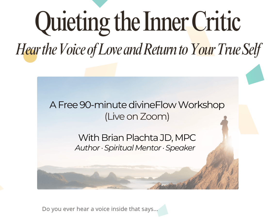 ----- And that kind of connects to something else I wanted to share with you: I signed up for this workshop that will be led by my author friend Brian Plachta. Brian is going to address the voices in our heads that criticize and judge us. He's called the workshop, Quieting the Inner Critic: A Divine Flow Workshop to Hear the Voice of Love and Return to Your True Self. You’ll find ways to: