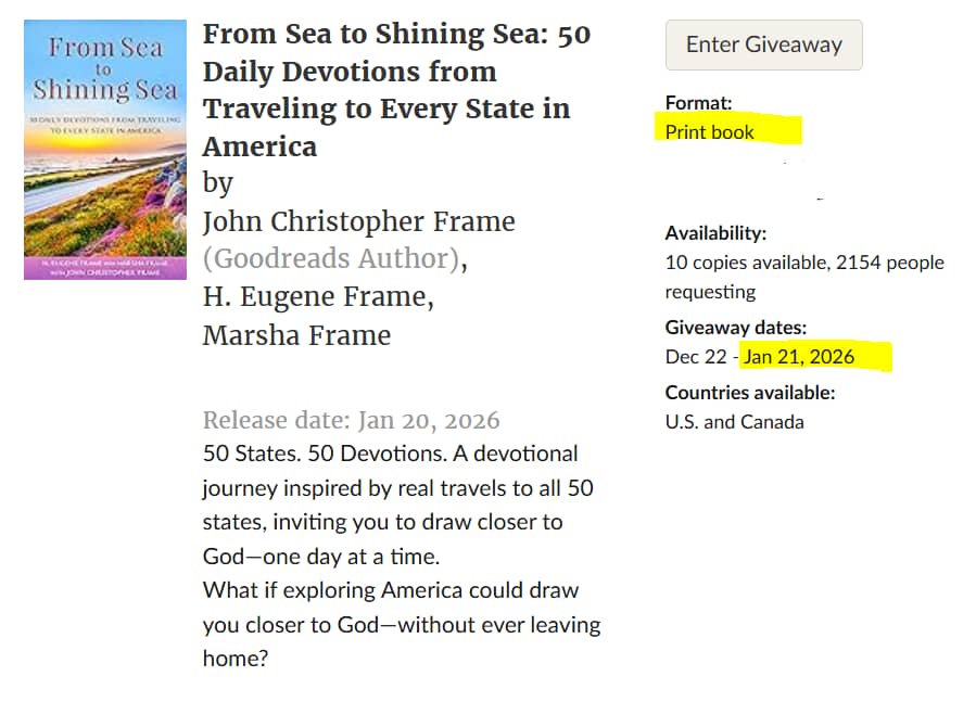 Book launches matter because early downloads, ratings, and reviews help the book reach readers who might not otherwise find it. And here's something you may be interested in... Would you like a chance to win a paperback copy of this book? You still have time to join others who have entered the giveaway on Goodreads: But the giveaway ends soon! So please enter today. Thanks for being part of my reader community. John Christopher Frame p.s. Here’s a short Bible verse to reflect on this weekend: If a friend or family member forwarded this email to you, and you'd like to receive my emails, too, just click this link and add your email address: https://www.johnchristopherframe.com/get-johns-emails _____________________________________________________________________ |